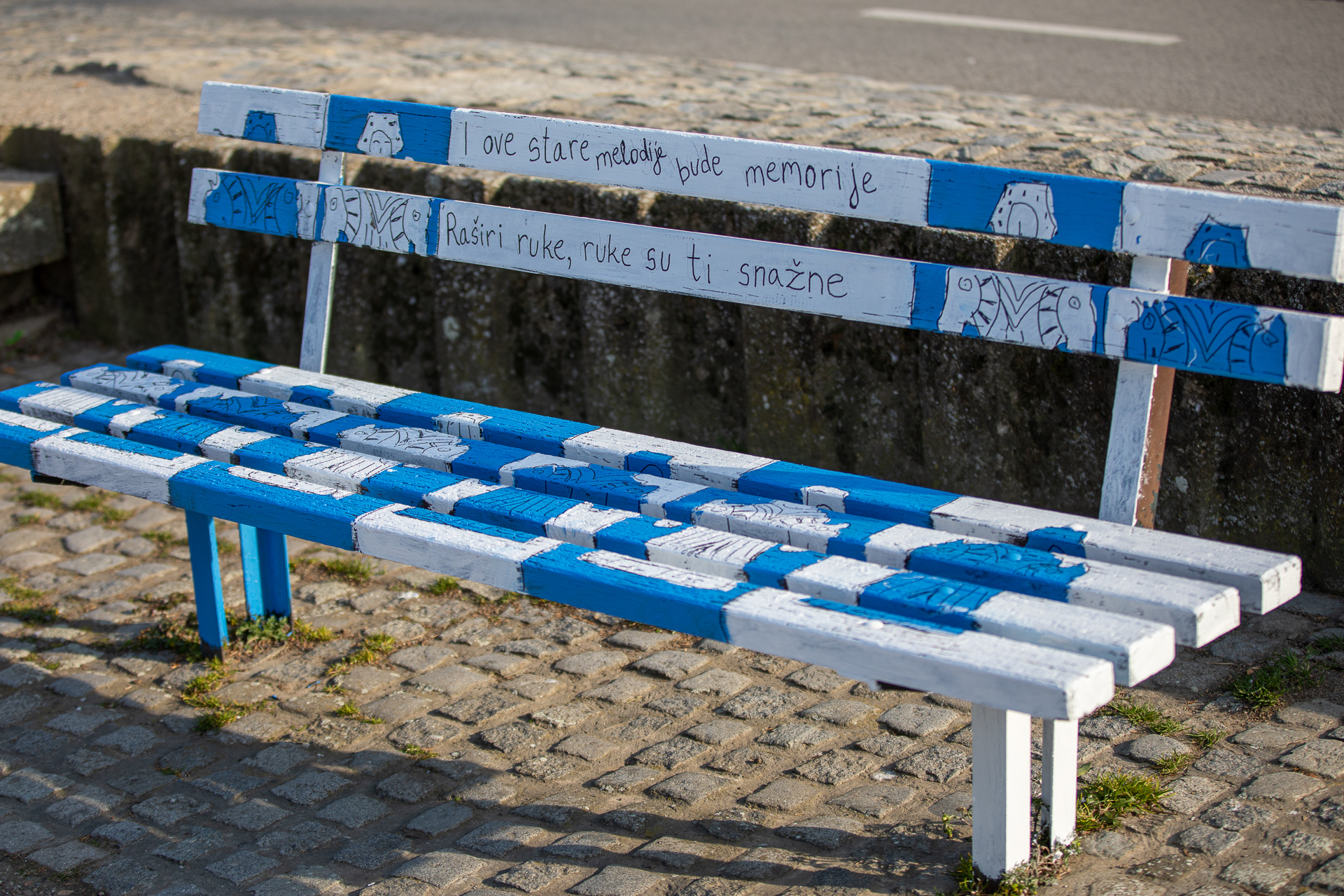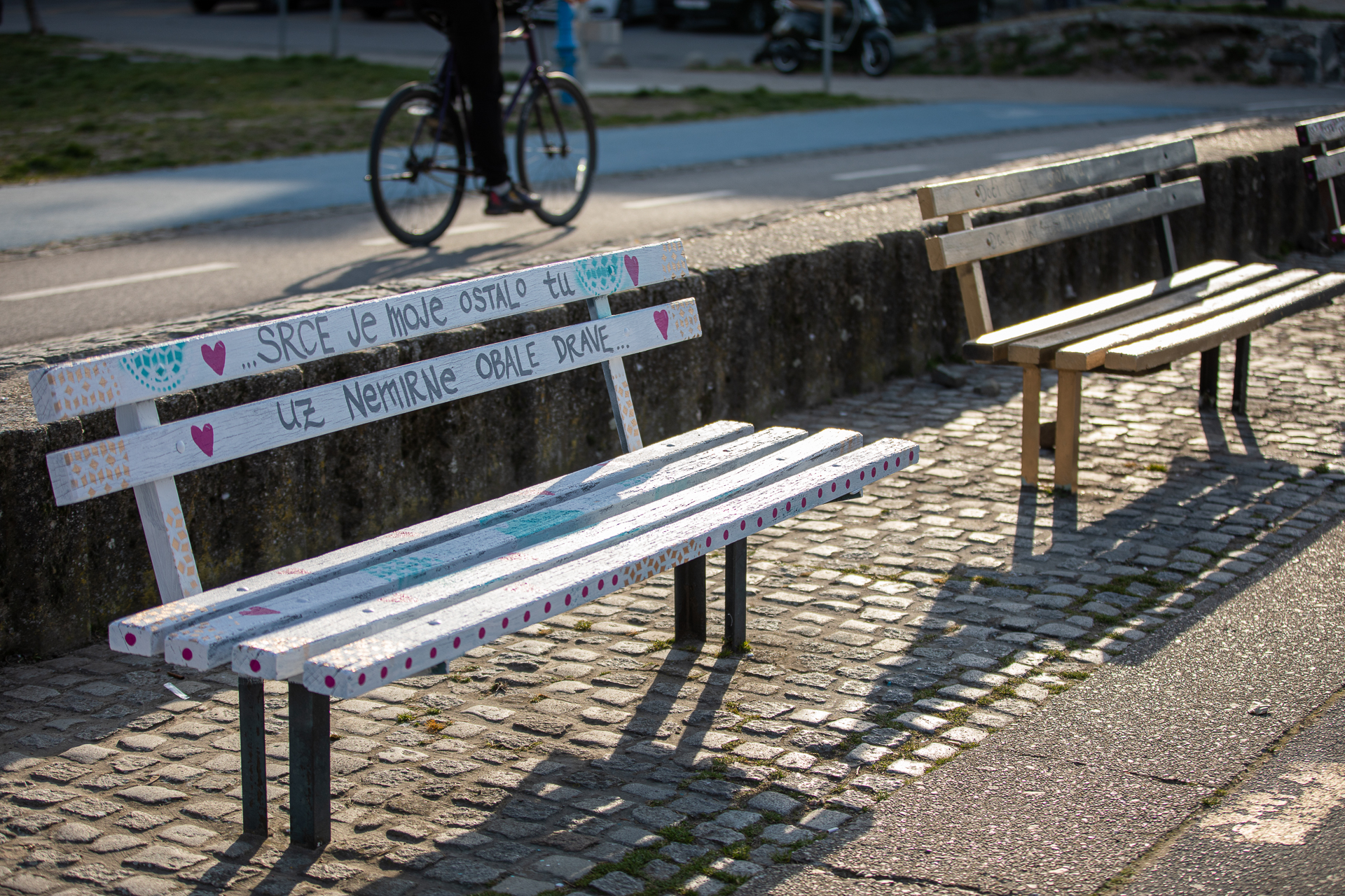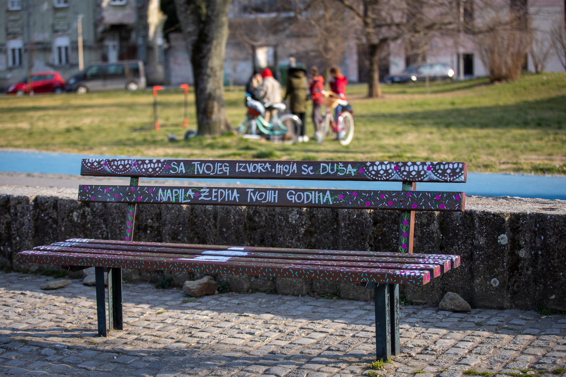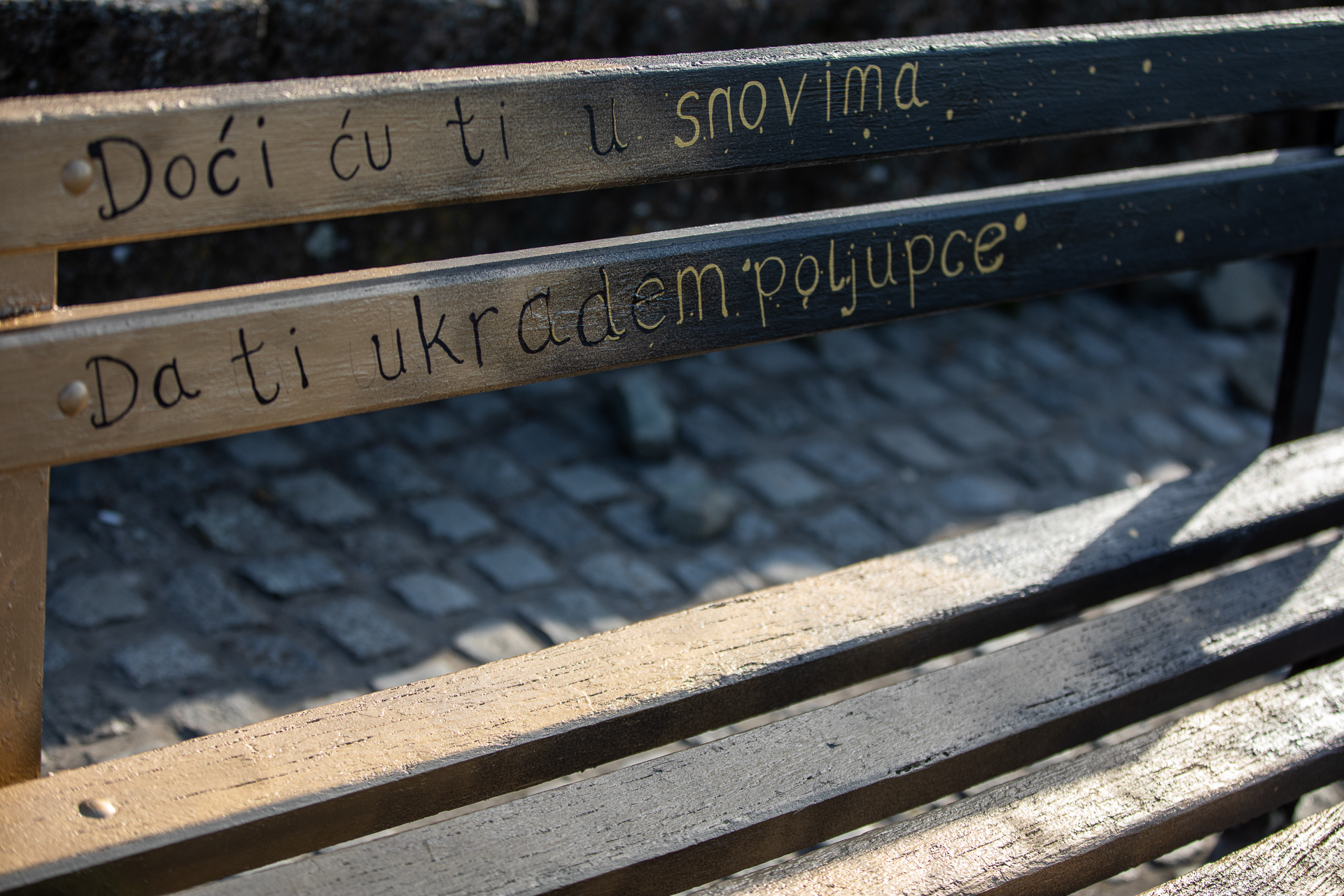 Na Akijevoj klupi ispisan je stih Sa tvojeg izvora, moja se duša napila, žedna tvojih godina iz pjesme “Sve još miriše na nju” za koju je Parni Valjak dobio nagradu Porin za pjesmu godine 1995. Na Jurinoj klupi ispisan je stih Doći ću ti u snovima, da ti ukradem poljupce, velikog hita Jure Stublića objavljenog na albumu “Zemlja sreće” 1989. godine. Na klupi koja je u znaku Osječanke Vere Svobode, osvanuo je stih Srce je moje ostalo tu, uz nemirne obale Drave iz pjesme “Osijek je duša duše moje”.