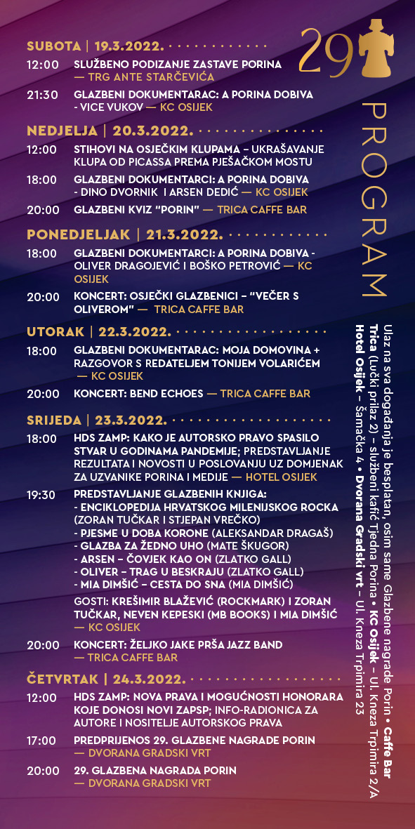 Isti dan s početkom u 18 sati predviđene su projekcije čak dva glazbena dokumentarca iz serijala “A Porina dobiva…” – filmovi o Dinu Dvorniku i Arsenu Dediću u KC Osijek. Nakon odličnih filmova, svi ljubitelji dobre glazbe i atmosfere pozvani su u službeni “Porinov kafić” – caffe bar Trica (Lučki prilaz 2) gdje će se od 20 sati održati glazbeni kviz “Porin” u kojem će sudionici moći osvojiti nagrade.