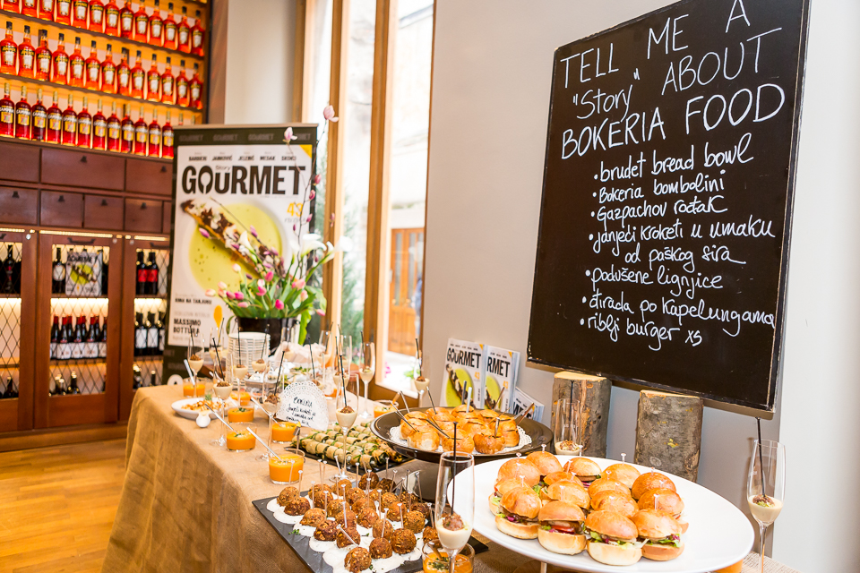 Uzvanici promocije StoryGourmeta kušali su vrsna jela pripremljena u aranžmanu popularnog splitskog restorana Bokeria kroz devet jela u slijedu – mini fish burger, brudet bread bowl,  Bomboline – pržene kuglice od pršuta u hrskavoj korici badema i ružmarina, Gazpachov rodak Salmorejo (hladna svježa juha od rajčica s maslinovim uljem, acetom, pršutom i kuhanim jajem, đirada po Kapelungama (kavijar od crvene morske trave, sirovi škamp, kavijar od crne morske trave, ikra morskog ježa, sirova tuna), janjeće kroketi u umaku od paškog sira, Podušene lignjice, Bokeria “na fete” open bar (Mortadella di Bologna, Parmigiano Reggiano) te soparnik sa skutom, medom i porilukom.